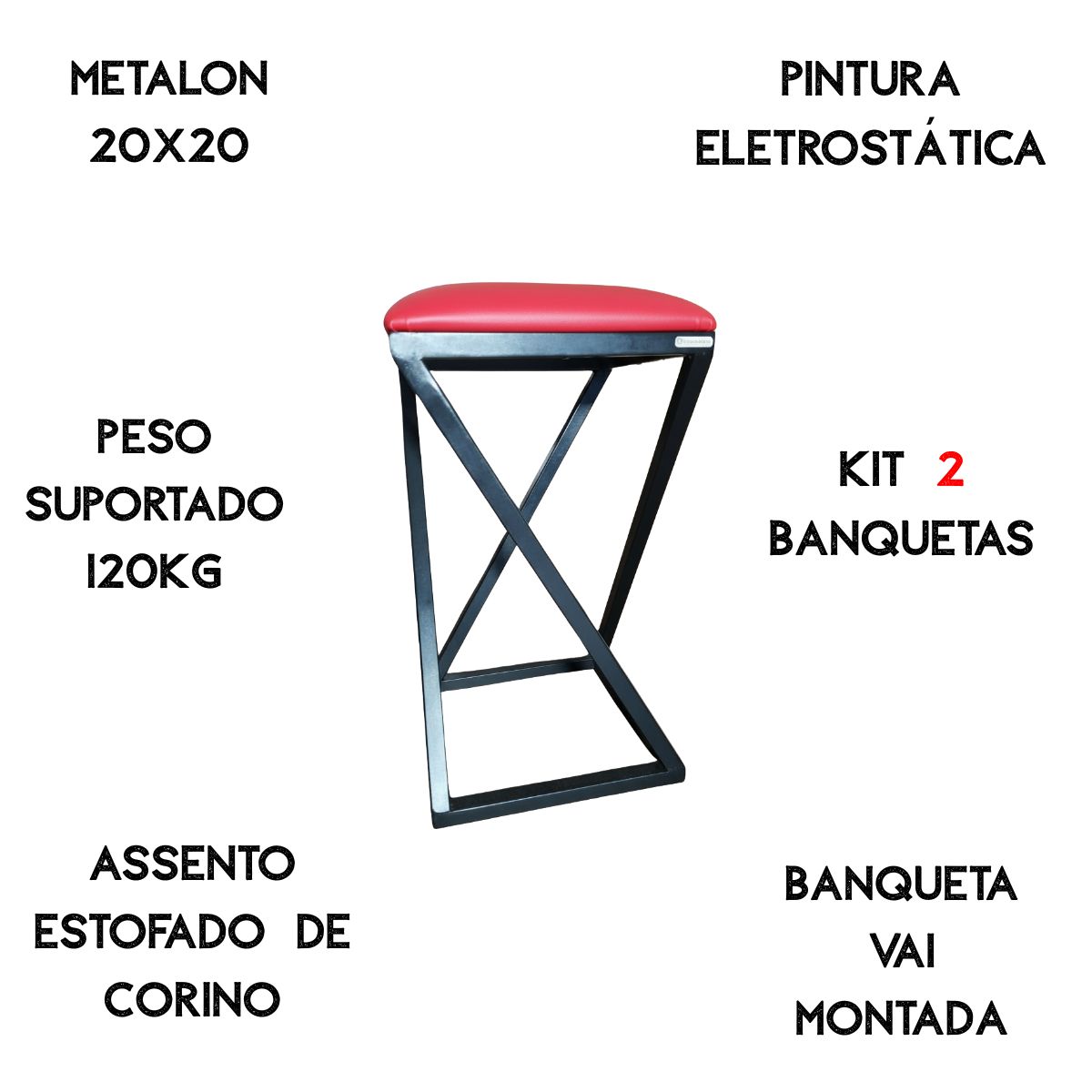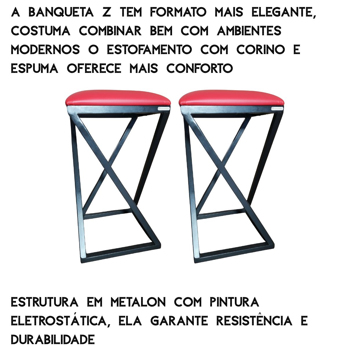 Com estrutura de metalon 20×20 e pintura eletrostática, as banquetas garantem longa durabilidade e um acabamento moderno. O assento estofado