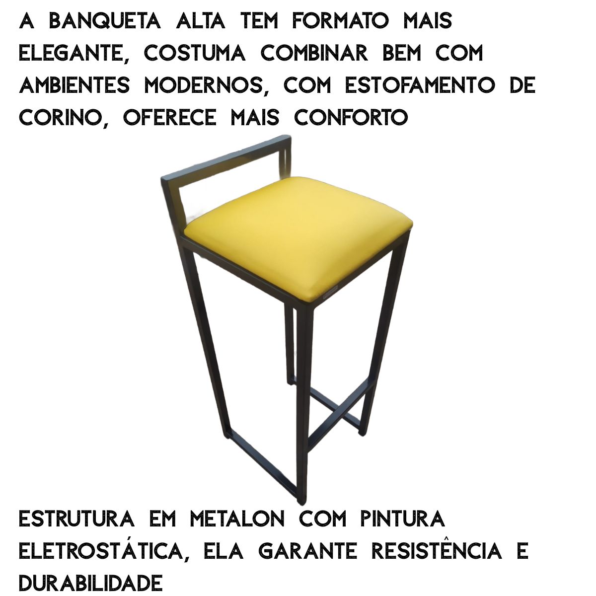 Outro diferencial é a pintura eletrostática, que oferece uma camada protetora contra ferrugem,riscos e desgaste natural, mantendo sua banqueta bonita e elegante por muito mais tempo.