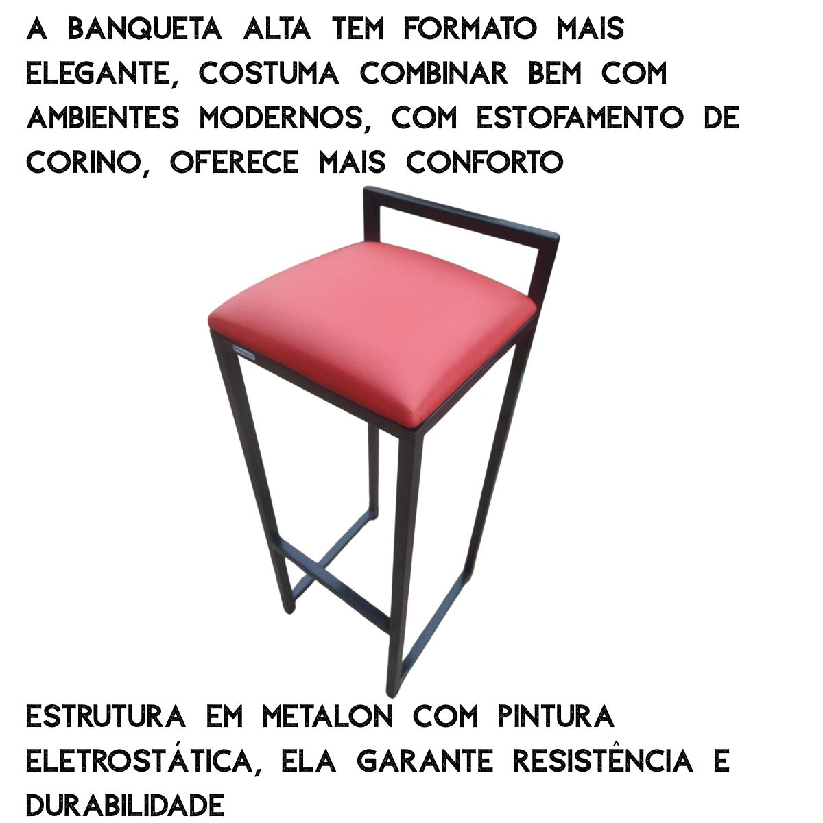 Outro diferencial é a pintura eletrostática, que oferece uma camada protetora contra ferrugem,riscos e desgaste natural, mantendo sua banqueta bonita e elegante por muito mais tempo.
