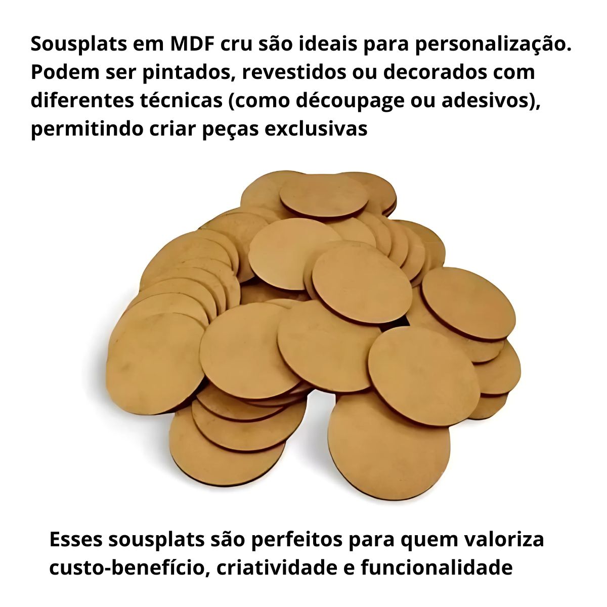 Este conjunto de Sousplat MDF cru conhecida pela sua qualidade e design. O kit inclui 100 bolachas de Sousplat, todas com um diâmetro de 10 cm, perfeitas para acomodar copos . O formato redondo dos Sousplat cru para decoração adiciona um toque de elegância e sofisticação à sua mesa.